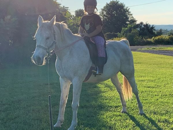Rhapsody, our elderly Arabian mare, sadly passed in October 2025. She was Laura's beloved partner and patiently taught both our children how to ride. In her younger days, she loved trail riding up and down hills and playing in water. She is deeply missed.