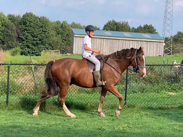 Potato is a Tennessee Walker. He and his half-sister Lovebug came to our farm as yearlings to grow and learn with our children, Justin and Emily. Potato thinks it's funny to tease his sister until she gets annoyed but would rather hide behind her when things get scary.