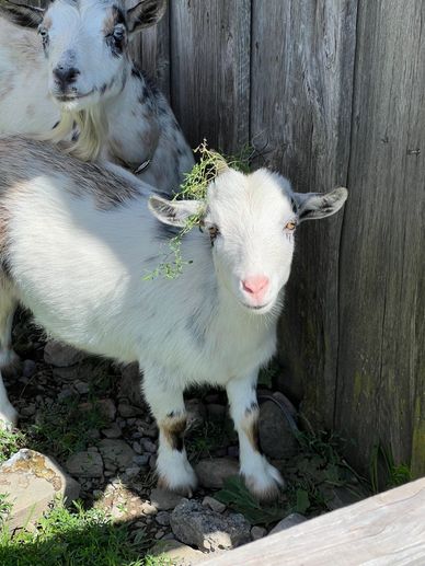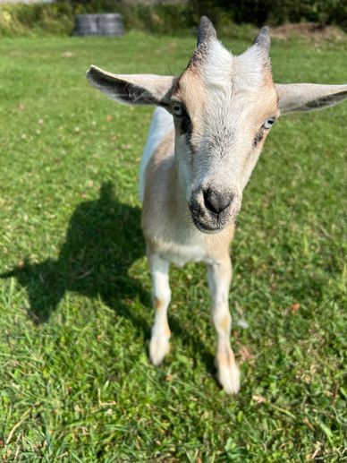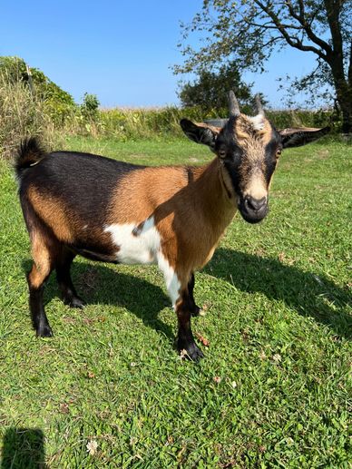 We acquired Ms.Clara as an adult after the passing our other original goat, Whitey. Blackie and Ms. Clara became instant best friends and are always together. Ms. Clara has blue eyes and is polled. She is a sweet goat and is greatly respected by the other does. Buddy is her grandson.