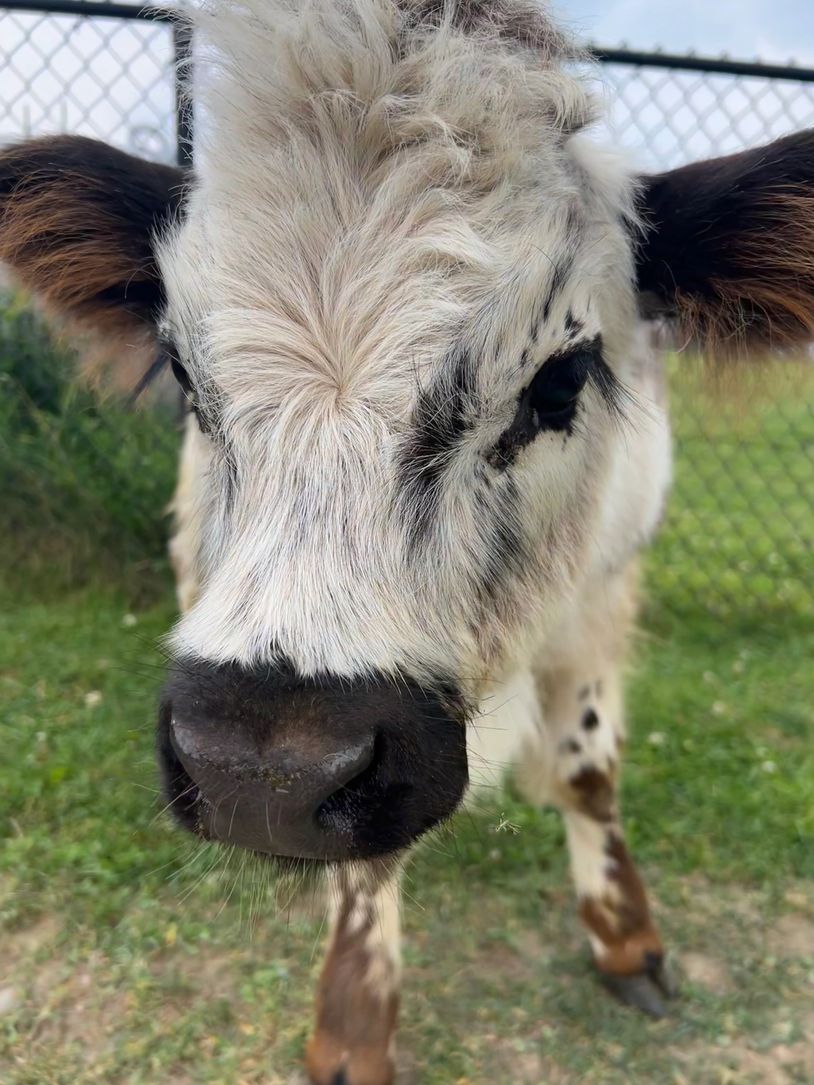 Allister (Scottish for "Defender of Men" but we say "Defender of Goats") is a Scottish Highland/Ancient White Park steer calf. He is just the sweetest, most laid-back guy unless he feels like something is threatening his babies, the goat kids. He will put himself between them and danger and moo loudly. Al just adores his babies and lets them bounce all over him and eat right out of his mouth.